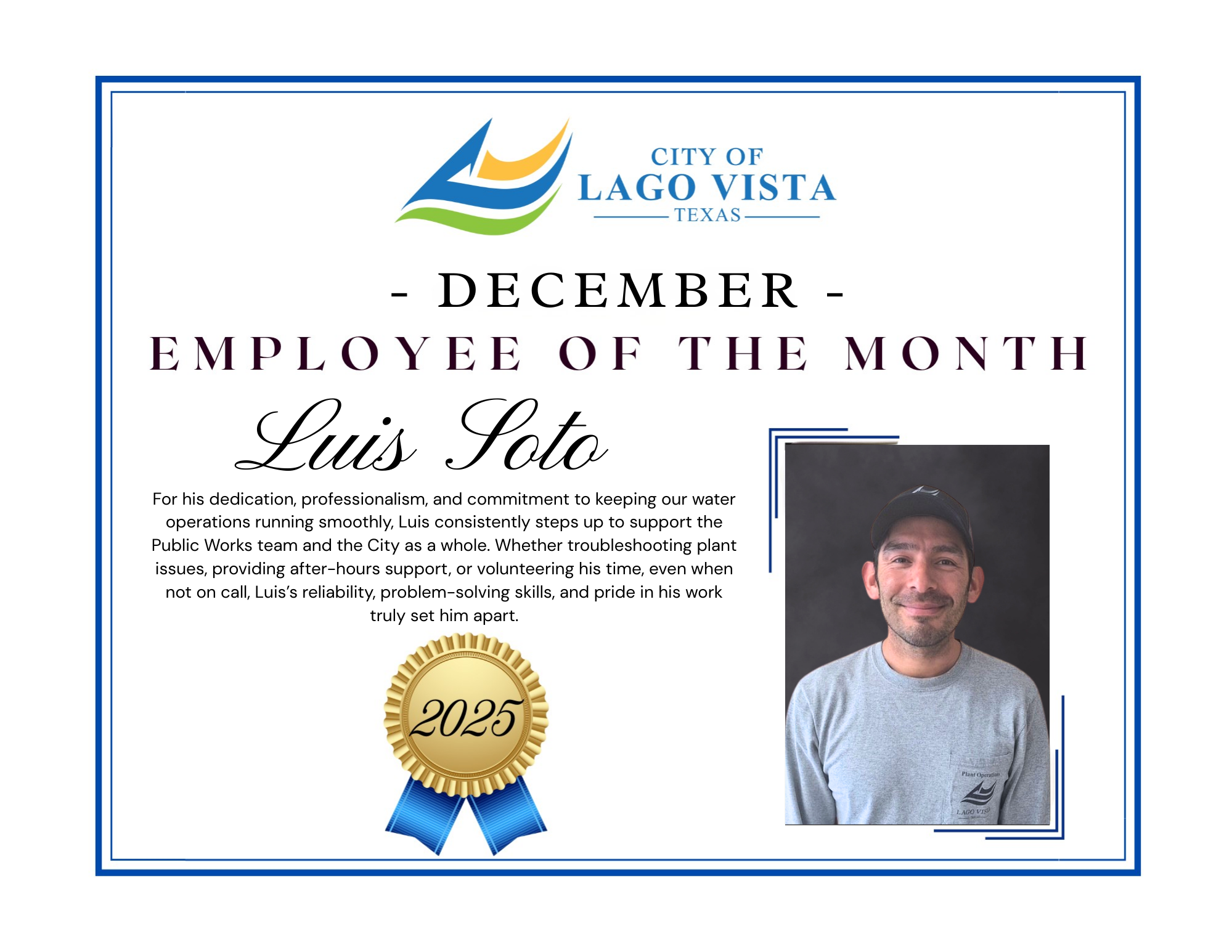 Luis, thank you for your dedication, commitment, and the vital role you play in serving the City of Lago Vista. We are grateful for all that you do.